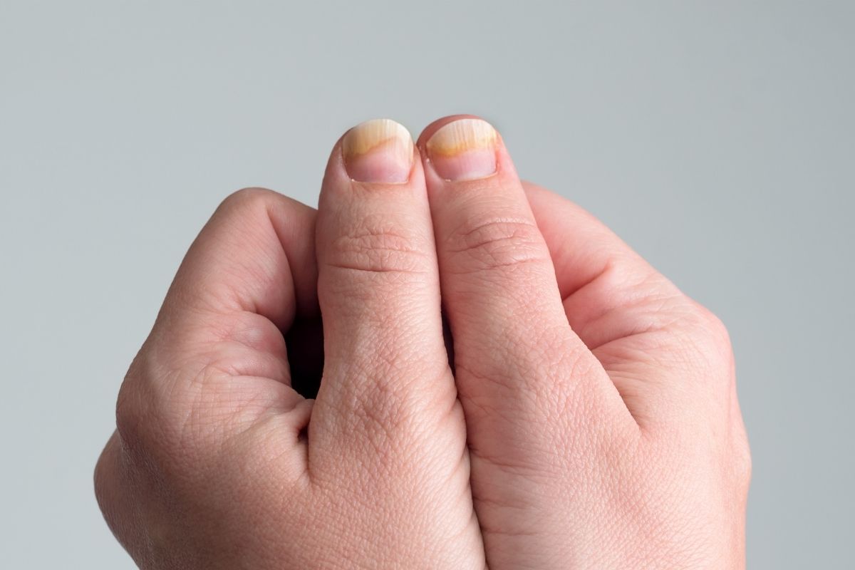 Popis obrázka: Začiatočné príznaky plesne nechtov na rukách – žlté sfarbenie, zmena štruktúry a poškodenie nechtovej platne.