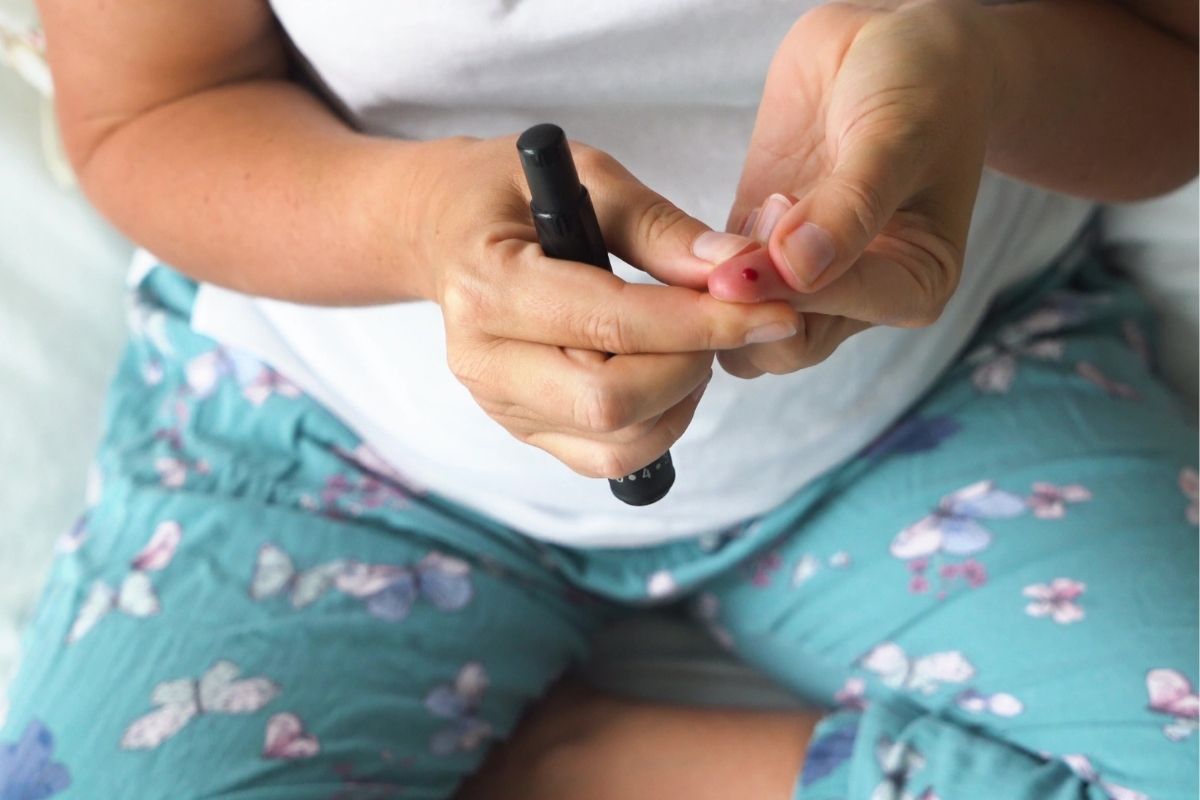 Tehotná žena meria hladinu cukru v krvi glukometrom – kontrola glykémie a OGTT test v tehotenstve